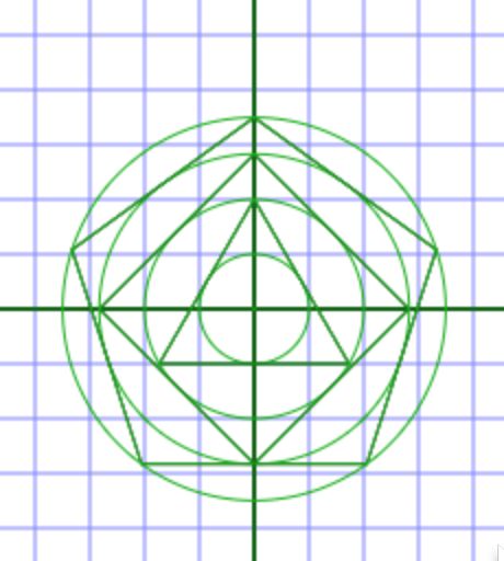 If the largest polygon is a pentagon, then the outer circle is slightly less than 3.5 times the innermost circle. She writes that, as number of sides in the polygon increases toward infinity, the outermost radius would approach a limit of 12 times that of the innermost circle.